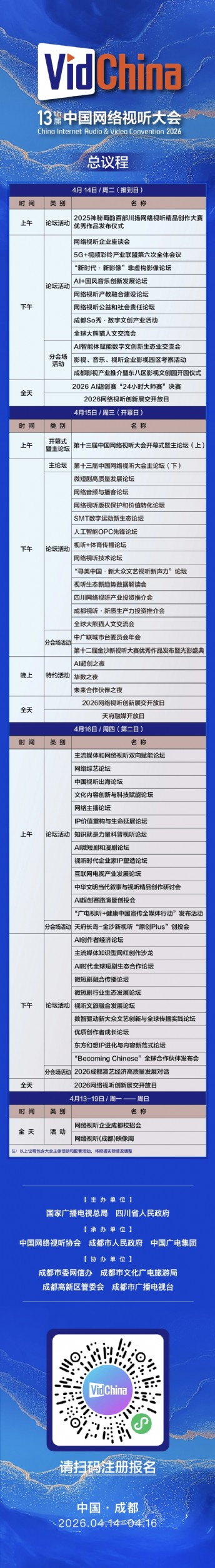 本届大会将于4月14-16日在成都举办。大会以“繁荣新大众文艺,共创新时代视听”为主题,着力打造“权威发布、成果展示、行业赋能、创新实践、大众共享”五大平台,以“4+8+8+N”为总体架构,即大会开幕式、主论坛、网络视听企业座谈会及2026网络视听创新展交开放日4场重点活动,围绕微短剧、新技术赋能、主流媒体与网络视听双向赋能、网络视听出海、综合治理与社会责任、网络直播、网络音频与播客等行业热点领域设置8个主要论坛,围绕8个全产业链版块设置系列主题论坛和N项大众共享活动。